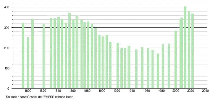 L'évolution du nombre d'habitants est connue à travers les recensements de la population effectués dans la commune depuis 1793. Pour les communes de moins de 10 000 habitants, une enquête de recensement portant sur toute la population est réalisée tous les cinq ans, les populations de référence des années intermédiaires étant quant à elles estimées par interpolation ou extrapolation[25]. Pour la commune, le premier recensement exhaustif entrant dans le cadre du nouveau dispositif a été réalisé en 2007[26].