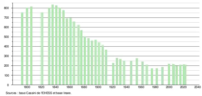 L'évolution du nombre d'habitants est connue à travers les recensements de la population effectués dans la commune depuis 1793. Pour les communes de moins de 10 000 habitants, une enquête de recensement portant sur toute la population est réalisée tous les cinq ans, les populations de référence des années intermédiaires étant quant à elles estimées par interpolation ou extrapolation[29]. Pour la commune, le premier recensement exhaustif entrant dans le cadre du nouveau dispositif a été réalisé en 2005[30].