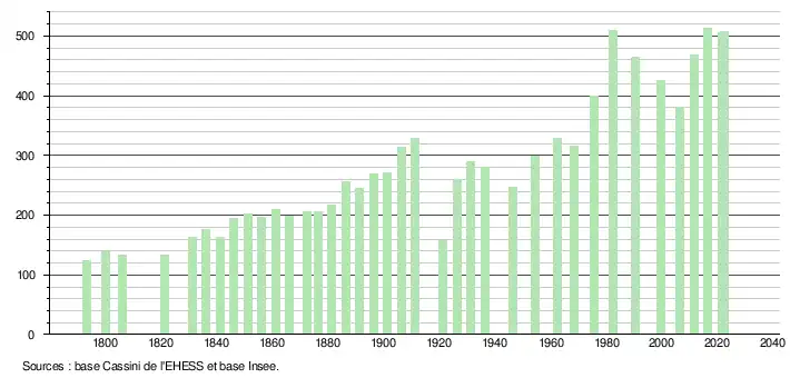 L'évolution du nombre d'habitants est connue à travers les recensements de la population effectués dans la commune depuis 1793. Pour les communes de moins de 10 000 habitants, une enquête de recensement portant sur toute la population est réalisée tous les cinq ans, les populations de référence des années intermédiaires étant quant à elles estimées par interpolation ou extrapolation[28]. Pour la commune, le premier recensement exhaustif entrant dans le cadre du nouveau dispositif a été réalisé en 2006[29].