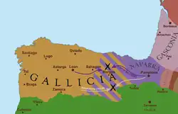 Avec l'arrivée des Suèves d'Europe centrale entre 409 et 411[5], la Galice cesse d'être la province romaine Gallaecia[6], pour devenir finalement un royaume dont la cour est installée à Braga, un royaume que les Suèves tentent rapidement d'agrandir vers le sud aux dépens de l'Empire romain, en incorporant à leur domaine, et de façon permanente, une bonne partie de la province romaine de Lusitanie, et en parvenant même à y inclure temporairement sa capitale Emerita Augusta (devenue Mérida)[7] en 439, et même la ville de Séville en 441, villes qui sont finalement abandonnées à la suite de la réaction des Wisigoths, dont l'épisode le plus important est la bataille de la rivière Órbigo.