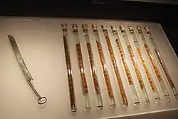 Un apport important des fouilles archéologiques est la découverte, dans des tombes antiques, de textes de nature variée, rédigés sur des supports divers, généralement à l'encre, qui résistent plus ou moins bien à l'usure du temps[8]. Les plus répandus sont ceux constitués de lamelles faites à partir de bambou coupé en deux, allongé puis poli, liées ensemble par des fils ou rubans de soie, permettant d'en faire un rouleau. Les textes écrits sur du bois qui sont connus pour cette période prennent l'aspect de tablettes. Le troisième support le plus répandu est celui qui a le moins bien survécu aux outrages du temps, la soie, support plus fragile mais plus cher que les deux autres, qui servait aussi pour des peintures[9]. Le bronze pouvait également être gravé, plutôt pour des textes solennels que l'on voulait durables et qui sont moins nombreux.
