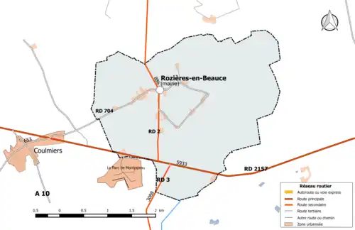 Réseau routier principal de la commune de Rozières-en-Beauce (avec indication du trafic routier 2014).