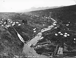 Pendant la ruée vers "l'or du Klondike", la vie se concentra autour des rivières aurifères qui alimentaient la rivière Klondike. Mais l'afflux massif de prospecteurs entraîna la formation de villes champignons dont Dawson City était la plus grande[165],[166]. Les nouvelles villes étaient surpeuplées et souvent anarchiques et la plupart disparurent à la fin de la ruée[167]. La majorité des prospecteurs était des hommes mais de nombreuses femmes se rendirent dans la région, souvent en tant qu'épouses[168]. Les mineurs ayant découvert de l'or dépensaient sans compter et suivaient un mode de vie extravagant, ce qui encouragea des hommes d'affaires à construire des hôtels et des lieux de divertissement[169]. Dawson City resta une ville relativement calme, grâce à la présence de la Police montée canadienne, alors que les villes champignons de Skagway et Dyea, sous juridiction américaine, devinrent célèbres pour leur criminalité[170],[171].