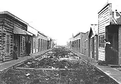 Puis arrivèrent les commerçants. Certains étaient venus avec l'idée bien définie de fournir des biens et des services aux futurs mineurs. D'autres, venus d'abord attirés par l'or et découvrant les difficultés pour atteindre Dawson City, choisirent de faire de même[174]. En quelques semaines, des magasins, des bars et des bureaux furent construits dans les rues boueuses de Dyea et de Skagway, entourés par des tentes et des taudis[165].