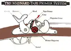 Les systèmes à percussion reposaient sur des petites en cuivre remplis de fulminate de mercure. Bien qu'ils aient considérablement amélioré la fiabilité des mousquets et leurs performances par temps humide, la lenteur de la cadence de tir des mousquets était toujours un problème car il fallait changer l'amorce à chaque tir. Le Dr Edward Maynard, un dentiste s'intéressant aux armes à feu, a incrusté de minuscules pastilles de matériau d'amorçage dans de fines bandes de papier, puis a collé une deuxième bande de papier sur la première, créant ainsi un ruban d'amorce. Le ruban pouvait être fabriqué rapidement et à moindre coût, car le papier était beaucoup moins cher que le cuivre. Maynard a également développé un système d'alimentation automatique qui ferait avancer la bande lorsque le marteau du mousquet était armé. Le marteau non seulement faisait exploser l'amorce, mais coupait également automatiquement le papier, éliminant ainsi la partie usée de la bande d'amorce.