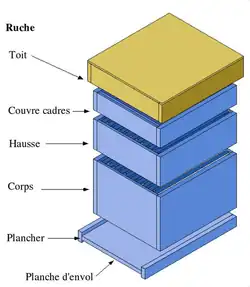 Les ruches verticales à cadres sont constituées d'un empilement de caissons ouverts au-dessus et en dessous dans lesquels sont emboîtés des cadres qui peuvent être déplacés indépendamment les uns des autres. On distingue :