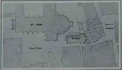 Restes de l'église st-Julien ayant sur la trace de sa nef la statue du baptême de Clovis.