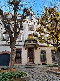 - Formant l'angle avec la rue de la Demi-Lune, cet immeuble de style néo-baroque a été construit en 1904 par Armand Richshoffer (1859-1937[9]) pour Charles Hahn, pionnier du cinéma en Alsace, dont les initiales (« C. H. ») figurent à côté de la date de construction sur le linteau surmontant une baie en forme de gueule béante au-dessus de la porte d'entrée[10].