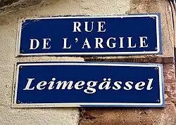 À partir de 1995, des plaques de rues bilingues, à la fois en français et en alsacien, sont mises en place par la municipalité lorsque les noms de rue traditionnels étaient encore en usage dans le parler strasbourgeois[11]. La rue est ainsi sous-titrée Leimegässel.