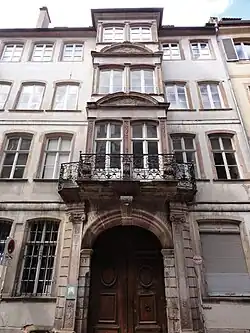 - C'était la maison de l'architecte du Palais Rohan, Joseph Massol, construite par et pour lui-même, un balcon en fer forgé y ayant été rajouté en 1751[4]. Parementée sur trois niveaux, la façade comporte des chaînes à refends, trois travées de baies et un avant-corps central. Elle n'est ornée que d'un seul mascaron, une allégorie de Minerve s'inspirant de celle du Palais Rohan. Sur l'égide, la déesse porte le compas et le traçoir des architectes[17].