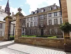 Hôtel Hohenlohe, puis Livio (no8).«Hôtel Hohenlohe» du nom de son commanditaire, ou «hôtel Livio», en référence à son propriétaire le plus connu, c'est le dernier hôtel strasbourgeois de l'Ancien Régime[17]. Sur le site d'anciens bâtiments ayant appartenu au Grand Chapitre[18], François Pinot, architecte de la cathédrale, construit une demeure pour le chanoine de Strasbourg, de Cologne et d'Ellwangen, le prince François-Charles-Joseph de Hohenlohe-Waldenburg-Bartenstein[17]. Les travaux sont achevés en 1791, peu de temps avant la confiscation de l'édifice par les autorités révolutionnaires qui le transforment en poste. L'hôtel est racheté en 1815 par Ignace Étienne de Livio, un homme d'affaires prospère, brièvement maire de Strasbourg en 1797 et 1800[19], qui y résidera effectivement. Le bâtiment abrite ensuite une brasserie, avant d’être acquis par un groupe de banquiers qui y fonde la Sogenal en 1881. La banque y conserve son siège jusqu'en 2001. Deux établissements d'enseignement supérieur privés, l'Iseg et l'Epitech, s'y installent[20]. Caractéristique du style Louis XVI, le bâtiment compte deux étages d'inégale hauteur qui se superposent sur l'appareil à refends du rez-de-chaussée. La travée centrale est rehaussée par deux balcons reposant sur des consoles aplaties et cannelées. La grille qui sépare le jardin de la rue est en fer de lance. Le portail est encadré de deux piles carrées surmontées de pots à feu à guirlandes végétales[17].