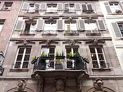 Maison Spach. Une ancienne maison d'artisan est reconstruite en 1751 pour l'orfèvre Balthasar Frédéric Spach. Très proche de celle du no17, quoiqu'un peu plus jeune et d'un décor sculpté plus élaboré, la façade en grès, elle aussi caractéristique du rococo strasbourgeois, possède quatre travées de fenêtres et trois arcades au rez-de-chaussée. Elle est ornée d'un balcon central sur consoles sculptées, avec une grille que Roland Recht considère comme un «véritable morceau de bravoure», la décrivant «faite de courbes et de contre-courbes rehaussées d'ornements en tôle repoussée où se retrouvent des “semis” de fleurs stylisées, des “fèves” en relief[3]». Sept mascarons sur cartouches représentent: au rez-de-chaussée des allégories (l'Espérance, le Temps, la Prudence); au premier étage les Quatre Saisons; au deuxième étage, les Quatre Éléments (eau, terre, feu, terre[28]). La façade fait l'objet d'un classement au titre des monuments historiques depuis 1927[29].