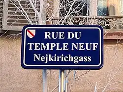 Des plaques de rues bilingues, à la fois en français et en alsacien, sont mises en place par la municipalité à partir de 1995[3]. C'est le cas de la Nejkirichgass.