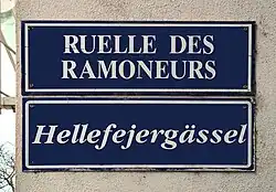 À partir de 1995, des plaques de rues bilingues, à la fois en français et en alsacien, sont mises en place par la municipalité lorsque les noms de rue traditionnels étaient encore en usage dans le parler strasbourgeois[4]. Le nom de cette ruelle est alors sous-titré Hellefejergässel.