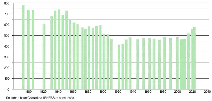 L'évolution du nombre d'habitants est connue à travers les recensements de la population effectués dans la commune depuis 1793. Pour les communes de moins de 10 000 habitants, une enquête de recensement portant sur toute la population est réalisée tous les cinq ans, les populations de référence des années intermédiaires étant quant à elles estimées par interpolation ou extrapolation[22]. Pour la commune, le premier recensement exhaustif entrant dans le cadre du nouveau dispositif a été réalisé en 2004[23].