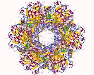 - KaiC forme un hexamère qui ressemble à un beignet double avec un pore central partiellement fermé à une extrémité[33]. Il y a douze site ligants (ponts chimiques) pour l'ATP - dans KaiC.