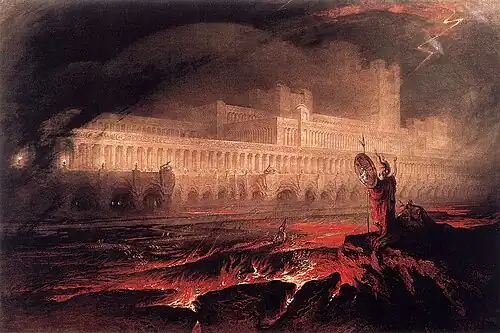 - Platon distingue : l'Hadès est le lieu propre de l'âme, et, semble-t-il, le monde intelligible, le monde des Idées, tandis que la punition des âmes se fait à l'intérieur de la terre (Phédon, 111e)[1]. Dans le Gorgias, Platon distribue le monde de l'au-delà en cinq régions : Paradis et Enfer sur l'axe des destinées, Asie et Europe sur l'axe des origines. Zeus fait juger les âmes des défunts par ses fils, Minos, Éaque, Rhadamante. Ils prononcent leurs sentences au centre d'une prairie d'où partent les routes verticales qui mènent au Paradis ou à l'Enfer et où aboutissent les routes horizontales par lesquelles les âmes venues d'Asie sont jugées par Rhadamante et celles venues d'Europe par Éaque. Minos tranche.