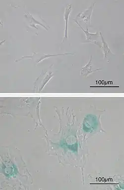 Le marquage de l’activité de la Senescence-Associated β-galactosidase (SA-βgal) est le plus couramment utilisé pour identifier des cellules sénescentes[13]. La β-galactosidase normalement active à pH 4,5 dans les lysosomes est capable de dégrader le composé X-gal dans des conditions non optimales (pH 6) dans les seules cellules sénescentes du fait de leur forte activité lysosomiale [14]. Bien que certaines études montrent que l’on puisse obtenir un marquage positif avec des cellules en forte confluence (Severino et al. 2000)[source insuffisante], le SA-βgal reste le marqueur le plus souvent utilisé pour identifier des cellules sénescentes in vitro comme in vivo.
