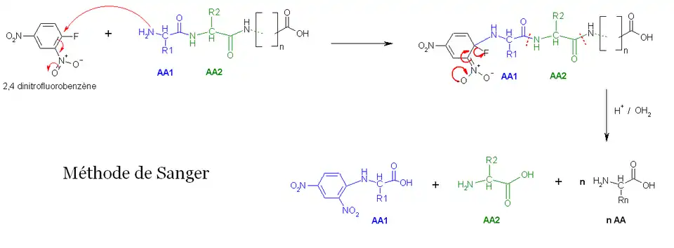 - La première méthode utilise la réaction de Sanger (cf. arylation). Les fonctions 2-amine des acides aminés et peptides réagissent avec le 2,4-dinitrofluorobenzène pour former des dérivés jaunes, les 2,4-dinitrophényl-peptides. Lorsque ces composés sont soumis à une hydrolyse acide, toutes les liaisons peptidiques sont hydrolysées, mais la liaison entre la fonction 2,4-dinitrophényl et la fonction amine de l'acide aminé N-terminal reste stable. On pourra par la suite identifier cet acide aminé, par chromatographie par exemple.