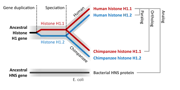 Des séquences homologues sont orthologues si on pense qu'elles ont divergé à partir d'une séquence ancestrale commune à la suite d'une spéciation : lorsqu'une espèce se scinde en deux espèces, les copies du gène d'origine dans chacune des deux nouvelles espèces sont dites orthologues. Ce terme a été introduit en 1970 par le spécialiste en évolution moléculaire Walter M. Fitch (en)[2].