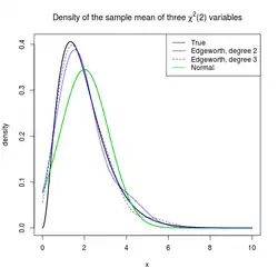Edgeworth a établi un développement similaire en tant qu'amélioration du théorème central limite[4]. L'avantage de la série d'Edgeworth est que l'erreur est contrôlée, de sorte qu'il s'agit d'un véritable développement asymptotique.