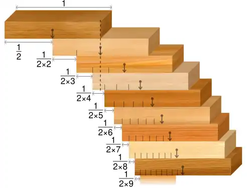 Dans le problème d'empilage de blocs, un calcul soigné montre qu'il est théoriquement possible d'empiler une arche formée de dominos identiques pour obtenir un surplomb aussi large qu'on veut, le surplomb obtenu à partir de dominos de longueur 2 étant le -ème nombre harmonique [6],[7]