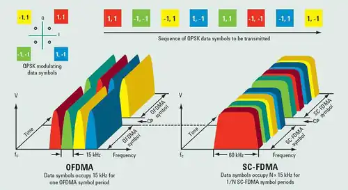 Contrairement à l'OFDM utilisé dans les réseaux Wi-Fi, il intègre, comme l'OFDMA, une fonction de multiplexage temporel (avec une base de temps "TTI" de 1 ms dans les réseaux mobiles LTE) qui permet de partager la bande de fréquence radio entre un plus grand nombre d'utilisateurs et avec plus de souplesse, cela permet notamment une adaptation rapide aux variations de débits qui caractérisent les flux d'accès à Internet.