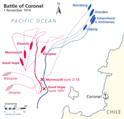 Le Scharnhorst et le Gneisenau se défont rapidement de leurs homologues britanniques tandis que le Leipzig tire sans succès sur le Glasgow. Le croiseur anglais parvient à toucher le Leipzig à 18 h 49 mais l'obus n'explose pas, sans doute en raison d'un défaut de fabrication. Le Leipzig et le Dresden enregistrent cinq coups au but sur le Glasgow avant que von Spee n'ordonne au Leipzig de se rapprocher du HMS Good Hope, alors très gravement endommagé, afin de le torpiller. Une bourrasque de pluie obscurcit alors le navire et quand le Leipzig arrive enfin à proximité du Good Hope, celui-ci a sombré corps et biens. Ignorant le naufrage du croiseur cuirassé, aucune tentative de sauvetage n'est mise en œuvre par l'équipage du Leipzig afin de repêcher d'éventuels survivants. Vers 20 h, le Leipzig croise inopinément le Dresden dans le brouillard, chacun des deux vaisseaux croyant initialement avoir affaire à un navire ennemi avant de parvenir rapidement à s'identifier[10]. Le Leipzig ressort quasiment intact de cet affrontement et sans aucun blessé à son bord[11].