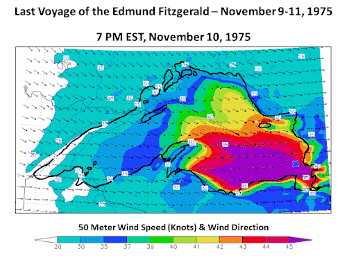 En 2005, le National Weather Service de la NOAA fit une simulation informatique des conditions météorologiques et de houle, pour la période allant du jusqu'au petit matin de , avec toutes les données disponibles et avec le plus récent modèle de prévision numérique du temps et des vagues[84]. L'analyse montra que deux zones distinctes de grands vents apparurent sur le lac Supérieur à 16 h le . Dans la première, la vitesse était supérieure à 43 nœuds (80 km/h) et dans l'autre, il était de plus de 40 nœuds (74 km/h)[85]. Sur la partie sud-est du lac, la direction vers laquelle le Fitzgerald se dirigeait, se retrouvaient les vents les plus forts donnant une hauteur des vagues moyennes de près de 5,8 m. Vers 19 h, les vents dépassaient les 43 nœuds (80 km/h) sur la majeure partie du sud-est du lac Supérieur[86].