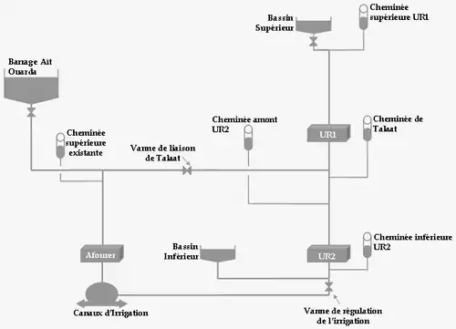 • Mode exceptionnel UR2 : c’est un transit d’eau entre le bassin inférieur et le barrage d’Aït Ouarda que ce soit en mode générateur ou en mode pompe.
