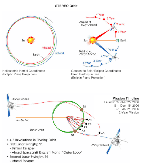 La mission STEREO comprend deux satellites observant les éruptions solaires tout en étant suffisamment écartés l'un de l'autre pour que les données collectées permettent de construire une image en trois dimensions de ces phénomènes. Pour parvenir à écarter les satellites, ceux-ci sont lancés ensemble sur une orbite terrestre à forte excentricité qui les fait passer près de la Terre puis à faible distance derrière la Lune. Les orbites des deux satellites sont modifiées légèrement de manière que deux mois après le lancement, l'un d'eux effectue un survol très rapproché de la Lune lui permettant d'utiliser son assistance gravitationnelle pour se placer sur une orbite héliocentrique en avant de la Terre. Un mois plus tard, le deuxième satellite utilise la même technique pour se placer derrière la Terre. Progressivement, les satellites s'écartent, formant un angle par rapport au Soleil qui s'élargit de 43° par an (cf. schéma 1). La mission doit durer au minimum deux ans[5]. Le coût de la mission, y compris le lancement et les phases opérationnelle et d'analyse des données, est estimé à 550 millions de dollars américains.