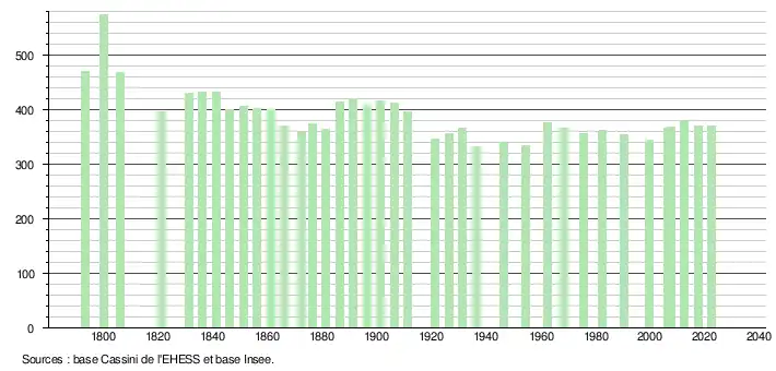 L'évolution du nombre d'habitants est connue à travers les recensements de la population effectués dans la commune depuis 1793. Pour les communes de moins de 10 000 habitants, une enquête de recensement portant sur toute la population est réalisée tous les cinq ans, les populations de référence des années intermédiaires étant quant à elles estimées par interpolation ou extrapolation[22]. Pour la commune, le premier recensement exhaustif entrant dans le cadre du nouveau dispositif a été réalisé en 2007[23].