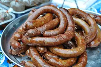 Cette saucisse[8] est faite de porc haché et assaisonné de citronnelle, de galanga, de feuilles de citron vert kaffir, d'échalotes, de coriandre, de piments, d'ail, de sel, de riz gluant et de sauce de poisson (padaek).