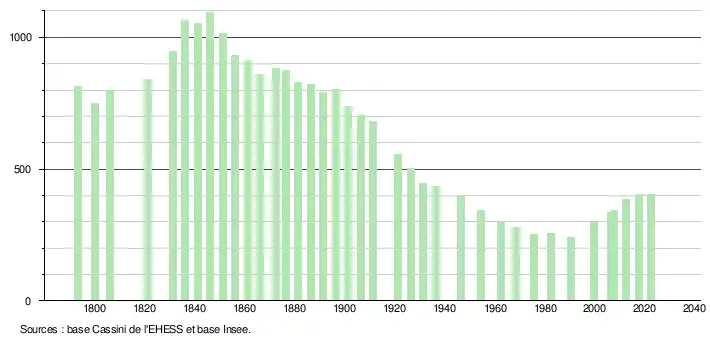L'évolution du nombre d'habitants est connue à travers les recensements de la population effectués dans la commune depuis 1793. Pour les communes de moins de 10 000 habitants, une enquête de recensement portant sur toute la population est réalisée tous les cinq ans, les populations de référence des années intermédiaires étant quant à elles estimées par interpolation ou extrapolation[16]. Pour la commune, le premier recensement exhaustif entrant dans le cadre du nouveau dispositif a été réalisé en 2007[17].