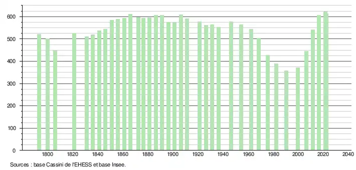L'évolution du nombre d'habitants est connue à travers les recensements de la population effectués dans la commune depuis 1793. Pour les communes de moins de 10 000 habitants, une enquête de recensement portant sur toute la population est réalisée tous les cinq ans, les populations de référence des années intermédiaires étant quant à elles estimées par interpolation ou extrapolation[15]. Pour la commune, le premier recensement exhaustif entrant dans le cadre du nouveau dispositif a été réalisé en 2006[16].