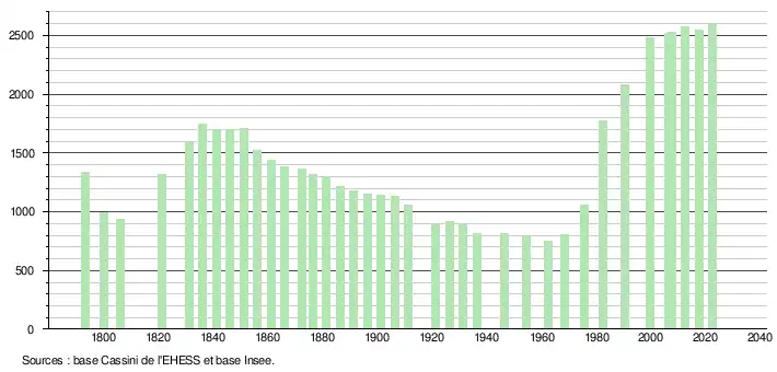 L'évolution du nombre d'habitants est connue à travers les recensements de la population effectués dans la commune depuis 1793. Pour les communes de moins de 10 000 habitants, une enquête de recensement portant sur toute la population est réalisée tous les cinq ans, les populations de référence des années intermédiaires étant quant à elles estimées par interpolation ou extrapolation[20]. Pour la commune, le premier recensement exhaustif entrant dans le cadre du nouveau dispositif a été réalisé en 2007[21].