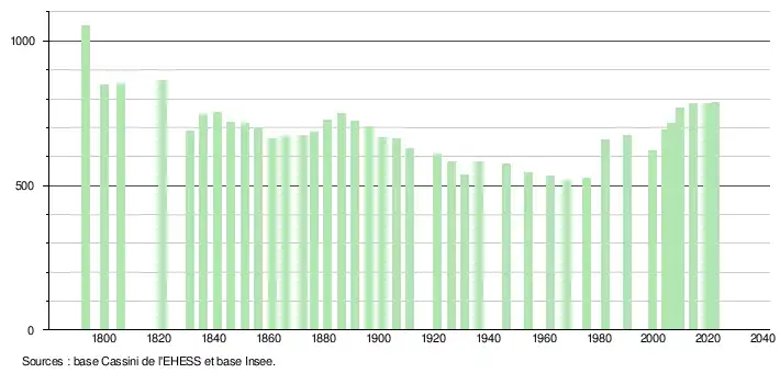 L'évolution du nombre d'habitants est connue à travers les recensements de la population effectués dans la commune depuis 1793. Pour les communes de moins de 10 000 habitants, une enquête de recensement portant sur toute la population est réalisée tous les cinq ans, les populations de référence des années intermédiaires étant quant à elles estimées par interpolation ou extrapolation[13]. Pour la commune, le premier recensement exhaustif entrant dans le cadre du nouveau dispositif a été réalisé en 2004[14].