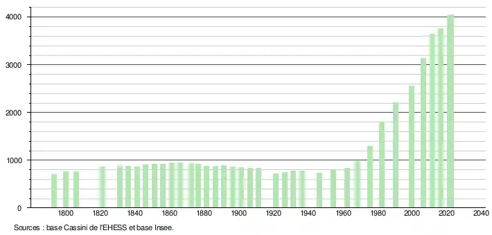L'évolution du nombre d'habitants est connue à travers les recensements de la population effectués dans la commune depuis 1793. Pour les communes de moins de 10 000 habitants, une enquête de recensement portant sur toute la population est réalisée tous les cinq ans, les populations de référence des années intermédiaires étant quant à elles estimées par interpolation ou extrapolation[31]. Pour la commune, le premier recensement exhaustif entrant dans le cadre du nouveau dispositif a été réalisé en 2006[32].