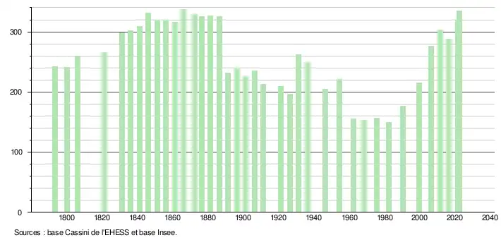 L'évolution du nombre d'habitants est connue à travers les recensements de la population effectués dans la commune depuis 1793. Pour les communes de moins de 10 000 habitants, une enquête de recensement portant sur toute la population est réalisée tous les cinq ans, les populations de référence des années intermédiaires étant quant à elles estimées par interpolation ou extrapolation[23]. Pour la commune, le premier recensement exhaustif entrant dans le cadre du nouveau dispositif a été réalisé en 2006[24].