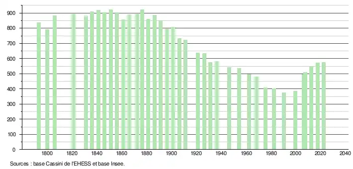 L'évolution du nombre d'habitants est connue à travers les recensements de la population effectués dans la commune depuis 1793. Pour les communes de moins de 10 000 habitants, une enquête de recensement portant sur toute la population est réalisée tous les cinq ans, les populations de référence des années intermédiaires étant quant à elles estimées par interpolation ou extrapolation[15]. Pour la commune, le premier recensement exhaustif entrant dans le cadre du nouveau dispositif a été réalisé en 2007[16].