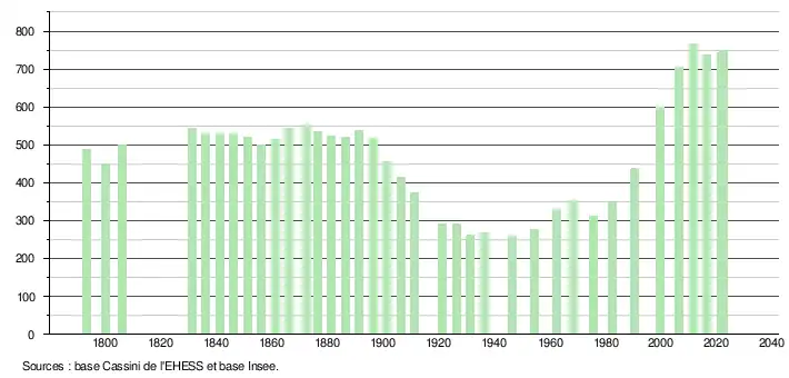 | L'évolution du nombre d'habitants est connue à travers les recensements de la population effectués dans la commune depuis 1793. Pour les communes de moins de 10 000 habitants, une enquête de recensement portant sur toute la population est réalisée tous les cinq ans, les populations de référence des années intermédiaires étant quant à elles estimées par interpolation ou extrapolation[26]. Pour la commune, le premier recensement exhaustif entrant dans le cadre du nouveau dispositif a été réalisé en 2006[27]. En 2022, la commune comptait 750 habitants[Note 4], en évolution de +1,9 % par rapport à 2016 (Tarn : +2,52 %, France hors Mayotte : +2,11 %). |