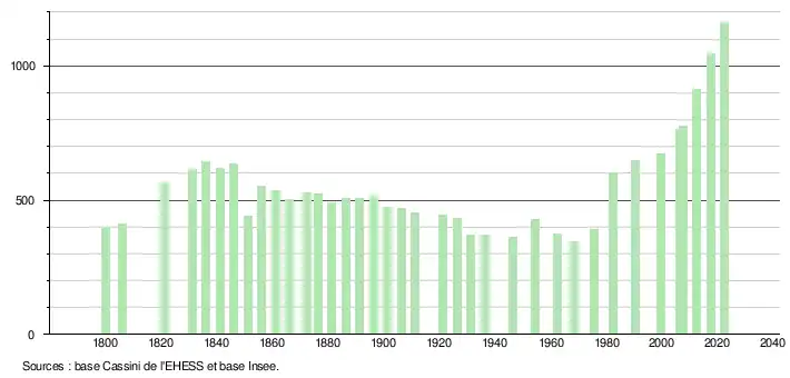 L'évolution du nombre d'habitants est connue à travers les recensements de la population effectués dans la commune depuis 1800. Pour les communes de moins de 10 000 habitants, une enquête de recensement portant sur toute la population est réalisée tous les cinq ans, les populations de référence des années intermédiaires étant quant à elles estimées par interpolation ou extrapolation[21]. Pour la commune, le premier recensement exhaustif entrant dans le cadre du nouveau dispositif a été réalisé en 2007[22].