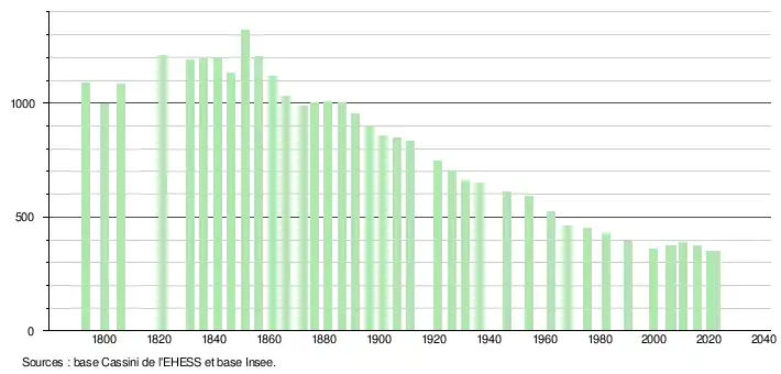 L'évolution du nombre d'habitants est connue à travers les recensements de la population effectués dans la commune depuis 1793. Pour les communes de moins de 10 000 habitants, une enquête de recensement portant sur toute la population est réalisée tous les cinq ans, les populations de référence des années intermédiaires étant quant à elles estimées par interpolation ou extrapolation[21]. Pour la commune, le premier recensement exhaustif entrant dans le cadre du nouveau dispositif a été réalisé en 2005[22].