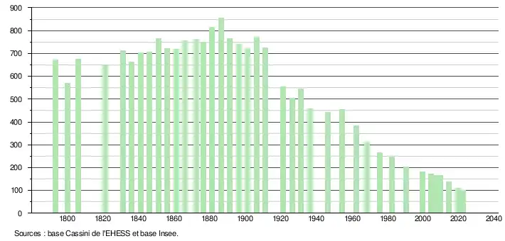 L'évolution du nombre d'habitants est connue à travers les recensements de la population effectués dans la commune depuis 1793. Pour les communes de moins de 10 000 habitants, une enquête de recensement portant sur toute la population est réalisée tous les cinq ans, les populations de référence des années intermédiaires étant quant à elles estimées par interpolation ou extrapolation[16]. Pour la commune, le premier recensement exhaustif entrant dans le cadre du nouveau dispositif a été réalisé en 2004[17].