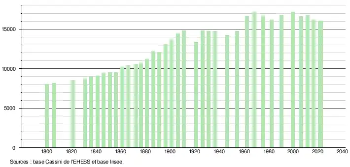 16 042 hab. (2022 en évolution de −0,65 % par rapport à 2016)