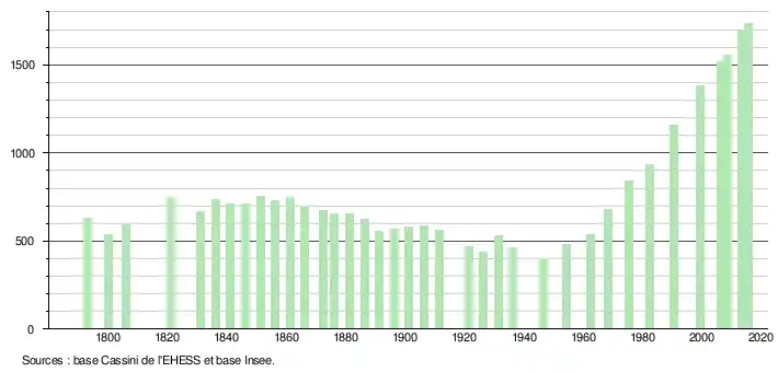 L'évolution du nombre d'habitants est connue à travers les recensements de la population effectués dans la commune depuis 1793. Pour les communes de moins de 10 000 habitants, une enquête de recensement portant sur toute la population est réalisée tous les cinq ans, les populations de référence des années intermédiaires étant quant à elles estimées par interpolation ou extrapolation[9]. Pour la commune, le premier recensement exhaustif entrant dans le cadre du nouveau dispositif a été réalisé en 2008[10].