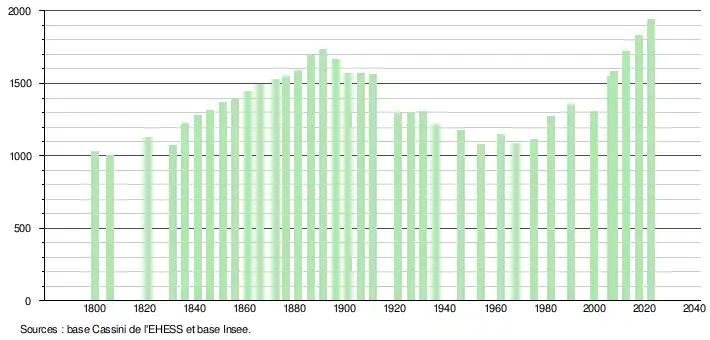 L'évolution du nombre d'habitants est connue à travers les recensements de la population effectués dans la commune depuis 1800. Pour les communes de moins de 10 000 habitants, une enquête de recensement portant sur toute la population est réalisée tous les cinq ans, les populations de référence des années intermédiaires étant quant à elles estimées par interpolation ou extrapolation[24]. Pour la commune, le premier recensement exhaustif entrant dans le cadre du nouveau dispositif a été réalisé en 2007[25].