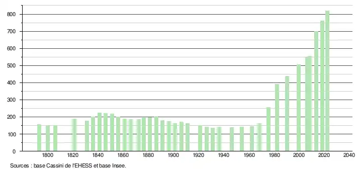 L'évolution du nombre d'habitants est connue à travers les recensements de la population effectués dans la commune depuis 1793. Pour les communes de moins de 10 000 habitants, une enquête de recensement portant sur toute la population est réalisée tous les cinq ans, les populations de référence des années intermédiaires étant quant à elles estimées par interpolation ou extrapolation[30]. Pour la commune, le premier recensement exhaustif entrant dans le cadre du nouveau dispositif a été réalisé en 2008[31].