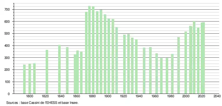 L'évolution du nombre d'habitants est connue à travers les recensements de la population effectués dans la commune depuis 1793. Pour les communes de moins de 10 000 habitants, une enquête de recensement portant sur toute la population est réalisée tous les cinq ans, les populations de référence des années intermédiaires étant quant à elles estimées par interpolation ou extrapolation[15]. Pour la commune, le premier recensement exhaustif entrant dans le cadre du nouveau dispositif a été réalisé en 2005[16].