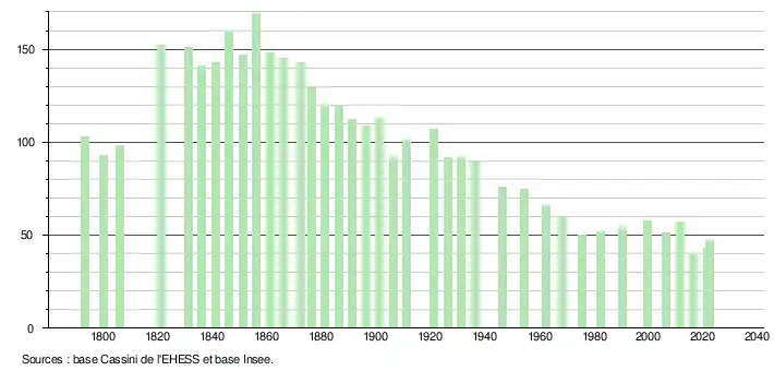 L'évolution du nombre d'habitants est connue à travers les recensements de la population effectués dans la commune depuis 1793. Pour les communes de moins de 10 000 habitants, une enquête de recensement portant sur toute la population est réalisée tous les cinq ans, les populations de référence des années intermédiaires étant quant à elles estimées par interpolation ou extrapolation[27]. Pour la commune, le premier recensement exhaustif entrant dans le cadre du nouveau dispositif a été réalisé en 2006[28].